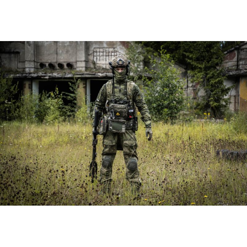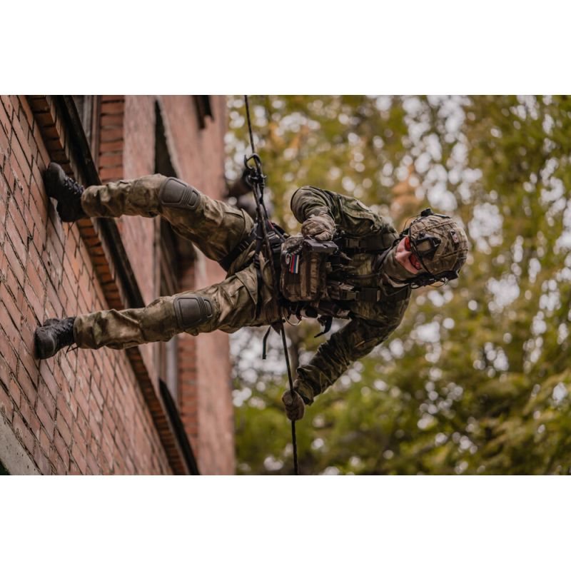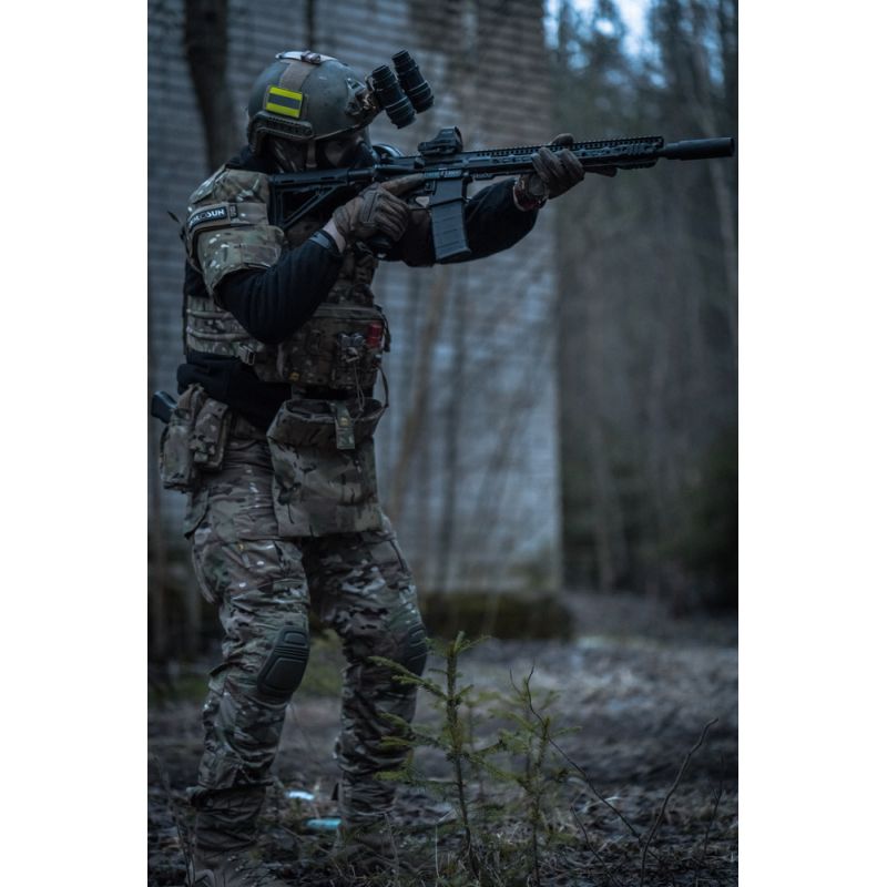 Усиления расположены в области колен со съемными вставками (приобретаются отдельно), высоту колена можно изменять при помощи стяжки внутри бокового верхнего кармана.